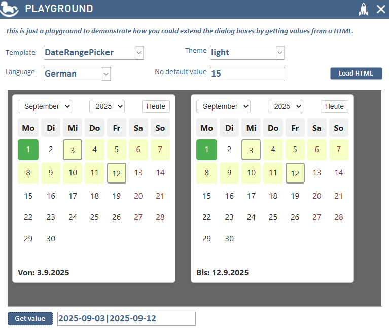 In addition to the actual dialogs, I have also included a playground. Here, I will briefly show you what else is possible with the new functions: