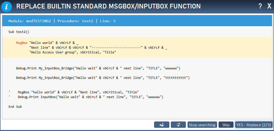 I had the privilege of giving a presentation at the Access User Group Europe. During the session, someone asked whether it would be possible to create a function that could automatically replace the built-in standard dialogs — MsgBox and InputBox.