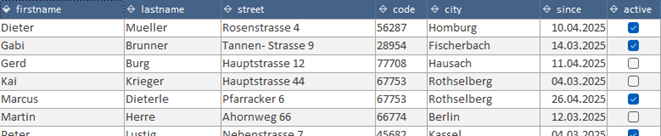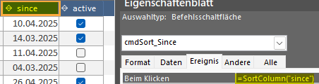 Ganz einfach: Anstatt für jede Spaltenüberschrift (Button) ein eigenes Click-Event zu bauen, nutzen wir eine zentrale Funktion im Formular. Beim Klick übergeben wir nur den Feldnamen an SortColumn(), und diese kümmert sich um den Rest.